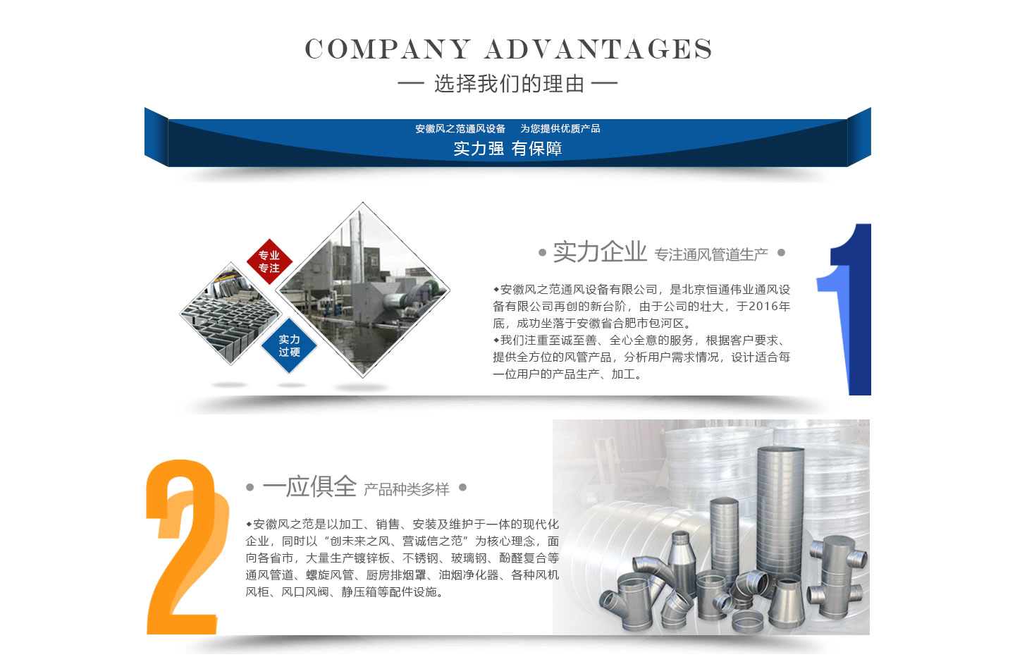 安徽風(fēng)之范通風(fēng)設(shè)備有限公司,是北京恒通偉業(yè)通風(fēng)設(shè)備有限公司再創(chuàng)的新臺階,多年來,公司員工憑著“誠信敬業(yè)、團(tuán)結(jié)拼搏、勇于開拓、務(wù)實(shí)進(jìn)取”的企業(yè)精神,先后承接了多項重點(diǎn)工程項目,使公司健康穩(wěn)步發(fā)展。現(xiàn)由于公司的壯大,業(yè)務(wù)的拓展,又于2016年底,成功坐落于安徽省合肥市包河區(qū)。本公司生產(chǎn)設(shè)備精良,技術(shù)力量雄厚,質(zhì)保體系完善!讓用戶體驗(yàn)到,貼心的服務(wù),無憂的售后!風(fēng)之范是以加工、銷售、安裝及維護(hù)于一體的現(xiàn)代化企業(yè),同時以“創(chuàng)未來之風(fēng)、營誠信之范”為核心理念,面向全國各省市,大量生產(chǎn)鍍鋅板、不銹鋼、玻璃鋼、酚醛復(fù)合等通風(fēng)管道、螺旋風(fēng)管、廚房排煙罩、油煙凈化器、各種風(fēng)機(jī)風(fēng)柜、風(fēng)口風(fēng)閥、靜壓箱等配件設(shè)施。廣泛承接商場、工廠、酒店、寫字樓、地下室等,消防排煙工程、除塵凈化工程、室內(nèi)通風(fēng)工程、暖通空調(diào)工程、廚房排煙凈化工程。我們力求上進(jìn),追求,歡迎各界人士技術(shù)指導(dǎo),經(jīng)濟(jì)合作,共創(chuàng)美好明天!